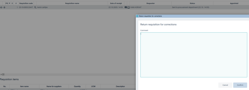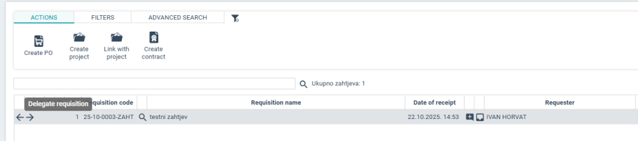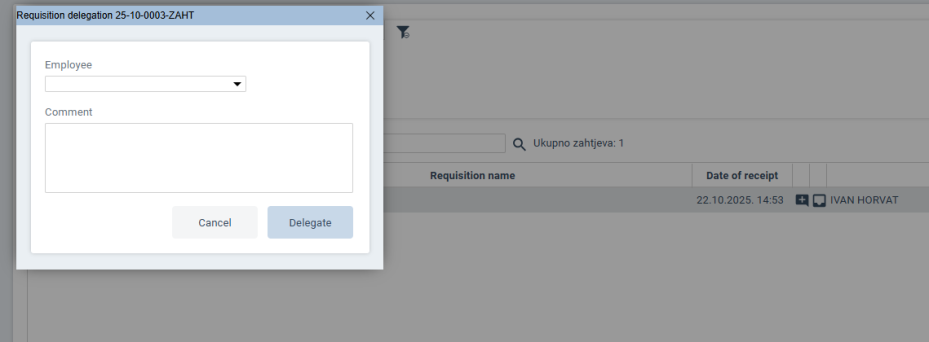 By clicking on the right arrow we can delegate the selected requisition to another user (from the procurement department). In the opened window it is necessary to select a user and (optionally) write a comment.