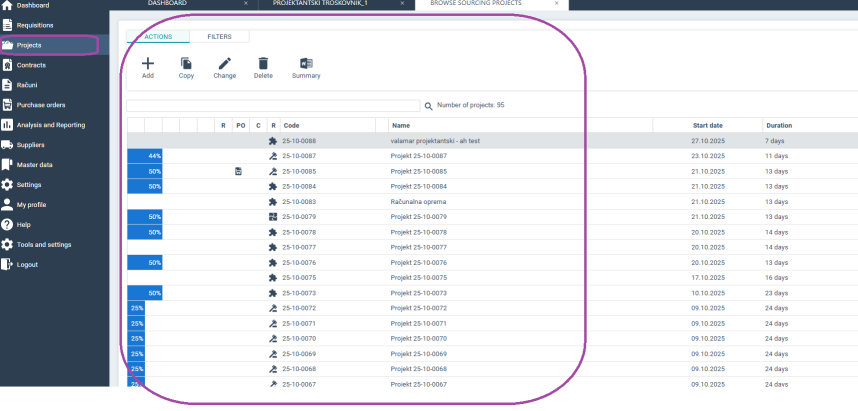 If you want to display only projects that contain RFx-es or e-Auctions, or only those created from a requistion or only test projects, you can use the filter in the upper right part of the screen.