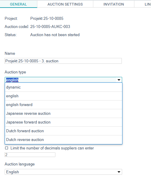 If you select the Japanese2The auction module in Ensolva can be used to execute a forward-type auction such as Japanese (forward) and Dutch (forward) auction types., Japanese reverse, Dutch, or Dutch reverse auctions, you must enter a bid start date / time 3The exact time of auction end depends on the bids submitted. , select the preferred auction language that will be used in the e-mail invitation to suppliers.