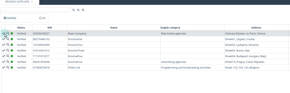 button, which will open a new screen for selecting suppliers. Note that in this way you can select among a larger supplier base (compared to using the drop-down menu) i.e. you can add suppliers that are registered in the Ensolva Supplier Network, but still not approved by your company.