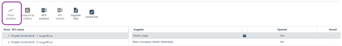 Clicking on the Price analysisbutton from the Browse bids screen opens a unique overview of submitted bids by all suppliers that have participated in the RFx.