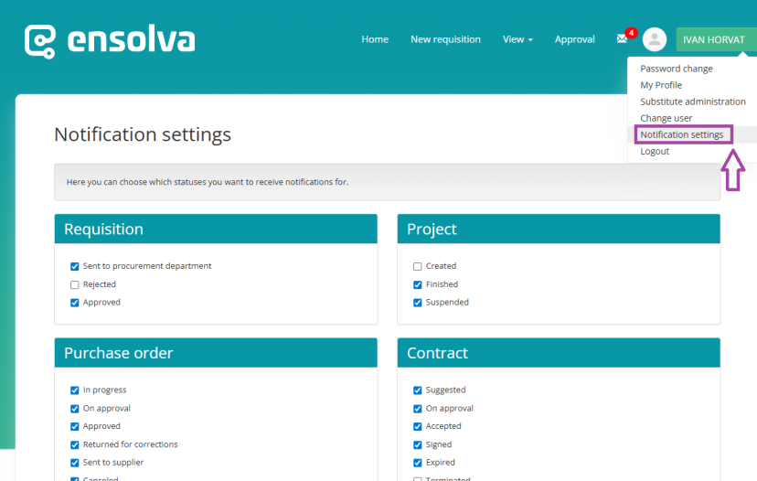 By clicking the “Notification Settings” button from the dropdown menu under the user’s name a menu opens where you can select, according to your needs, the statuses for which you want to receive notifications.