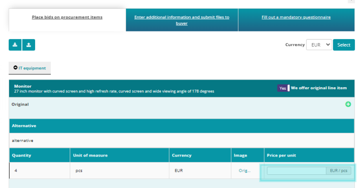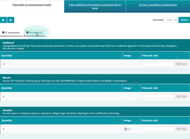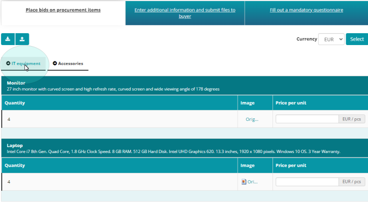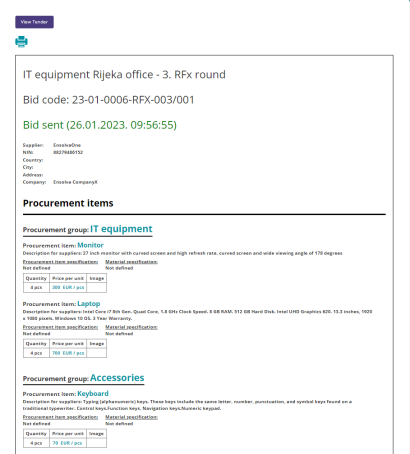 Each procurement item can be specified in the Invitation to Tender by a description, attached documentation (Buyer's attached documents), a description of the item itself along with the item's name, a picture, or some other elements that describe the procurement item in greater detail.