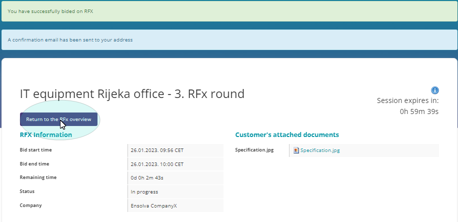The offer is sent to customer by clicking the Send offer button.1Offer is possible to send an unlimited number of times for the duration of the RFx, and the buyer sees the last sent offer..