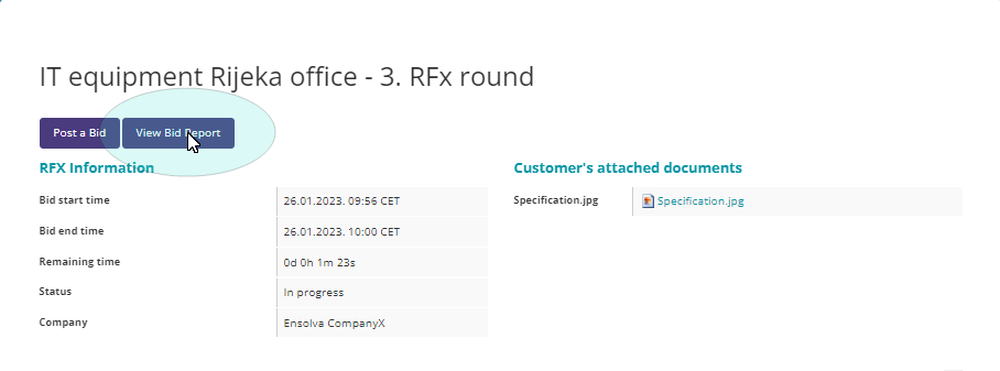 When you choose the "View Bid report" option, a screen with details about the saved or sent offer opens (the status of the offer is visible in the report itself).