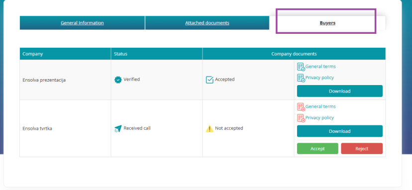 The Customers tab contains a list of all customers for whom the company is a verified supplier, as well as those for whom acceptance of the General Terms and Conditions & Privacy Policy is required.
