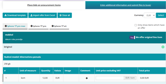 The space for providing an alternative offer of the procurement item is automatically opened when the No option is chosen. You can type in the model name, picture, and price.