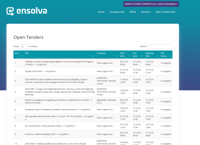 A list of all open bids appears when you choose Open Tenders from the menu.