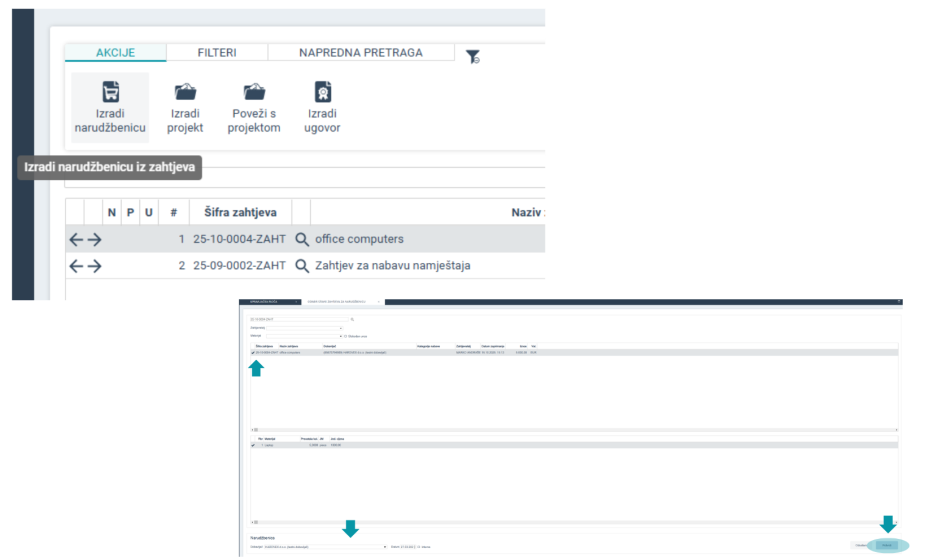 Kada izrađujemo narudžbenicu na temelju Zahtjeva, nakon klika na gumb Izradi narudžbenicu otvara se prozor u kojem je potrebno označiti stavku sa Zahtjeva koju želimo prenijeti.