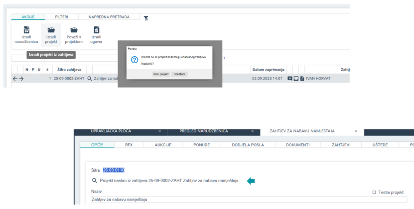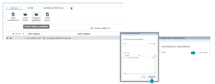 Nakon odabira kliknemo na gumb Potvrdi. Projekt se tada automatski kreira, a njegov naziv sadrži naziv povezanog Zahtjeva.