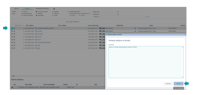 Klikom na odabrani Zahtjev možemo vratiti na doradu uz obvezan unos komentara.