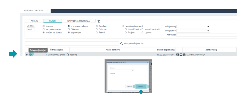Klikom na možemo delegirati odabrani zahtjev drugom korisniku. Na otvorenom prozoru potrebno je upisati korisnika i komentar.
