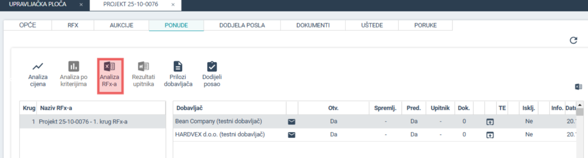 Ponude za alternativne predmete nabave moguće je prebaciti u MS Excel odabirom opcijeAnaliza RFx-a.
