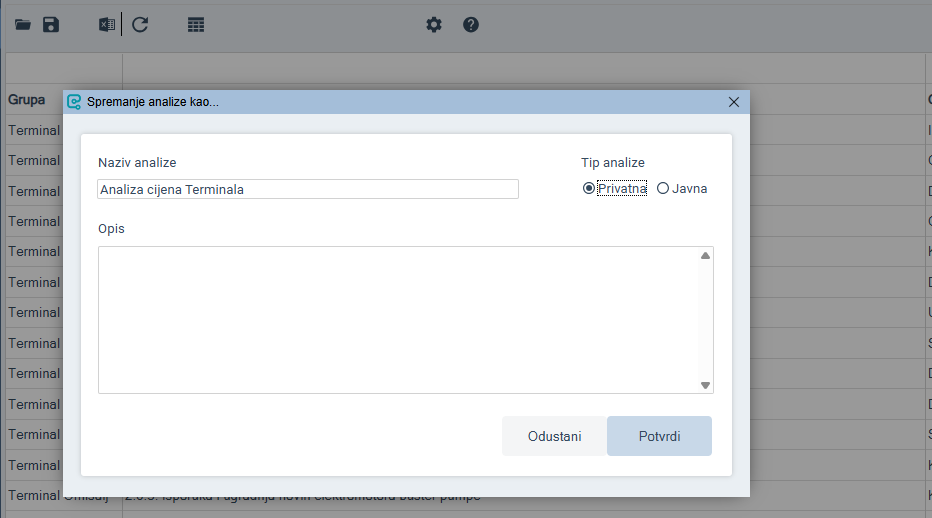 Klikom na gumb moguće je pohraniti provedenu analizu. Prilikom spremanja moguće je dodati opis analize i odrediti hoće li biti Javna (dostupna svim članovima tima) ili Privatna (vidljiva samo voditelju nabavnog projekta).