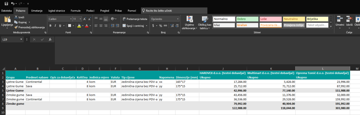 • Rangiranje ponuda dobavljača po predmetima nabave