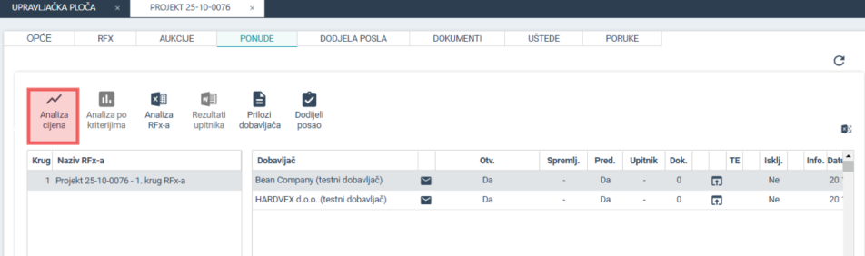 Na Pregledu ponuda klikom na Analiza RFx-a otvara se pregled dostavljenih ponuda svih dobavljača koji su sudjelovali na Rfx-u.