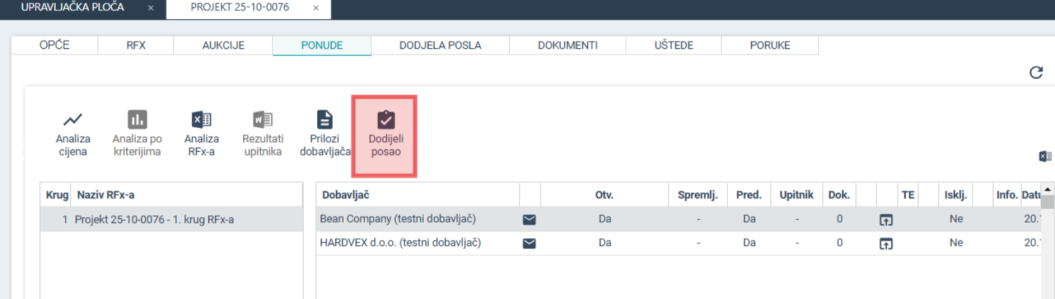 1. dodjela sa ekrana Ponude gdje se označi željeni dobavljač i klikne gumb Dodijeli posao.1Kada posao želimo dodijeliti samo jednom dobavljaču.