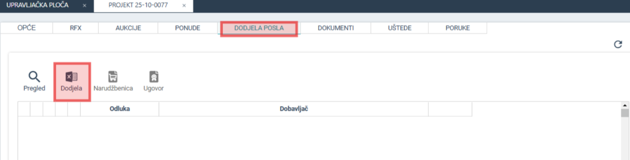 - U izborniku projekta na ekranu Dodjela posla odabrati gumb Dodjela iz Excela i učitati spremljenu Excel tablicu. Sada sustav automatski dodjeljuje posao dobavljaču, te se u stupcu Odluka pojavljuje status Odabran.