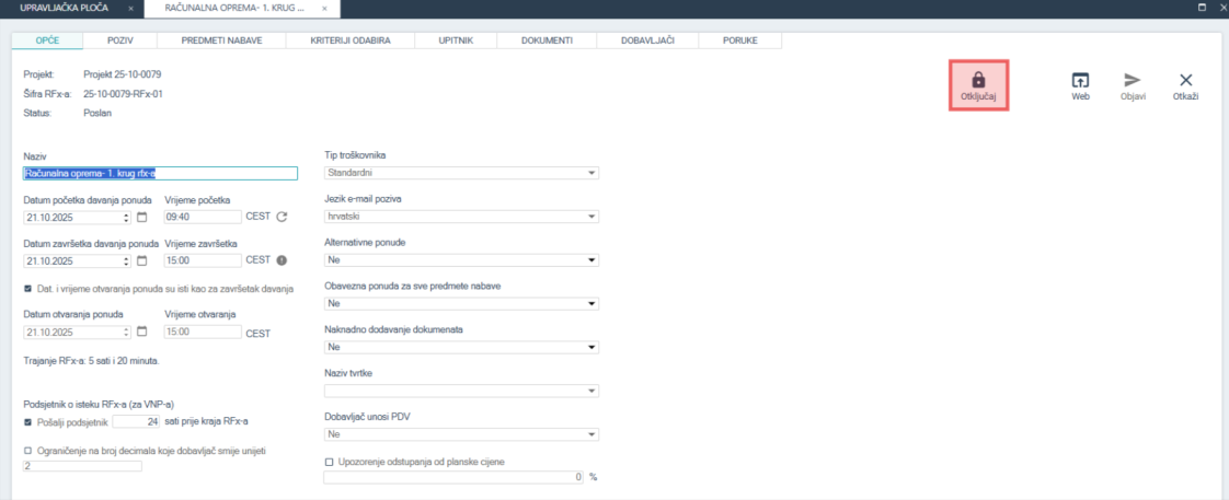 Tijekom trajanja natječaja, RFx je moguće otključati klikom na gumb