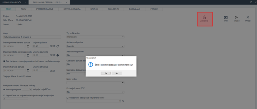 Nakon ažuriranja RFx je potrebno zaključati klikom na gumb Zaključaj, nakon čega se pojavljuje obavijest ako želimo obavijestiti dobavljače o izmjenama na natječaju.