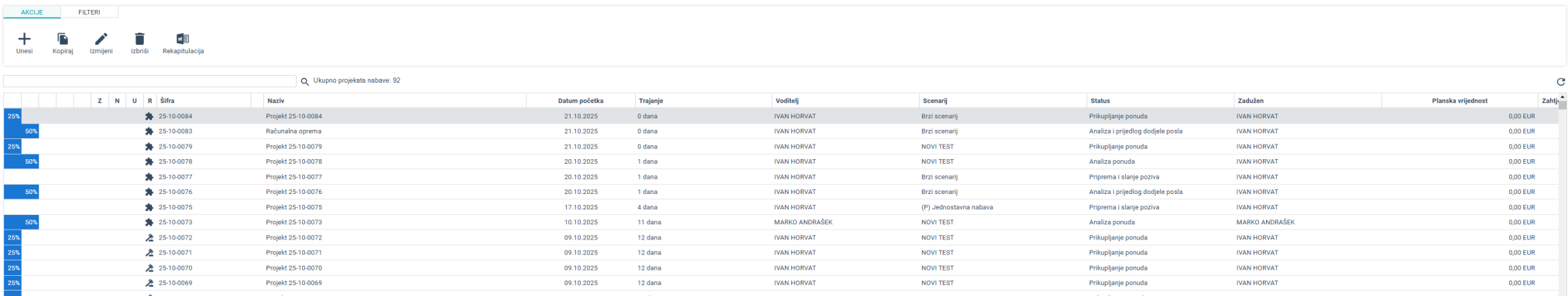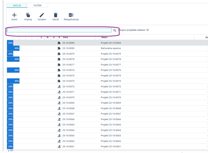 U gornjem dijelu ekrana nalaze se tabovi Akcije i Filteri. Tab akcije sadrži gumbove za akcije na projektimaUnesi, Kopiraj, Izmjeni,Izbriši Rekapitulacija , dok tab filteri sadrži opcije za filtriranje/pretraživanje projekata.