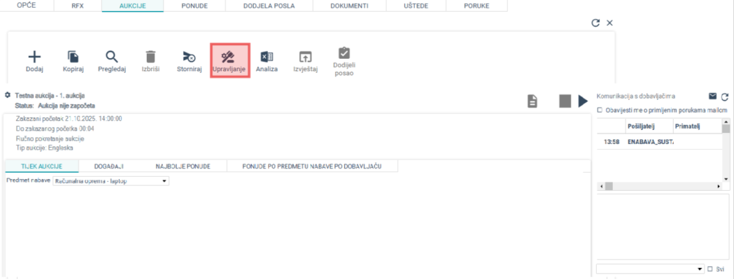 Nakon što smo dobavljačima poslali poziv za sudjelovanje na aukciji, potrebno je otvoriti ekran Upravljanje aukcijom.