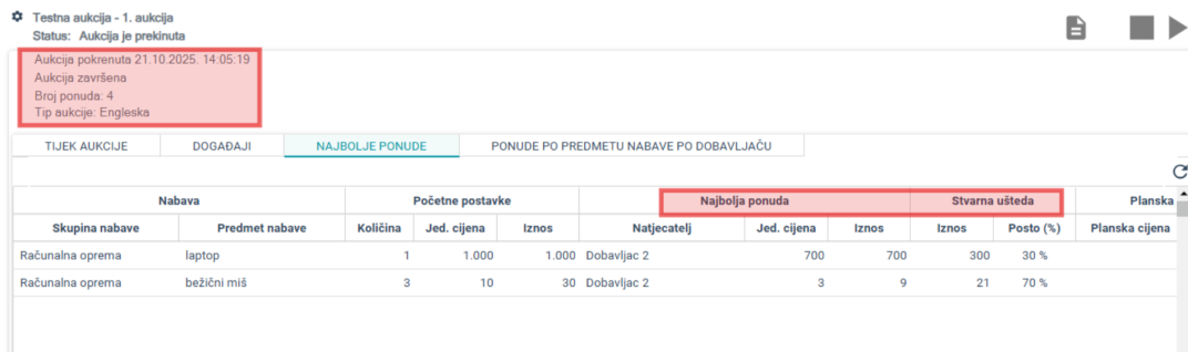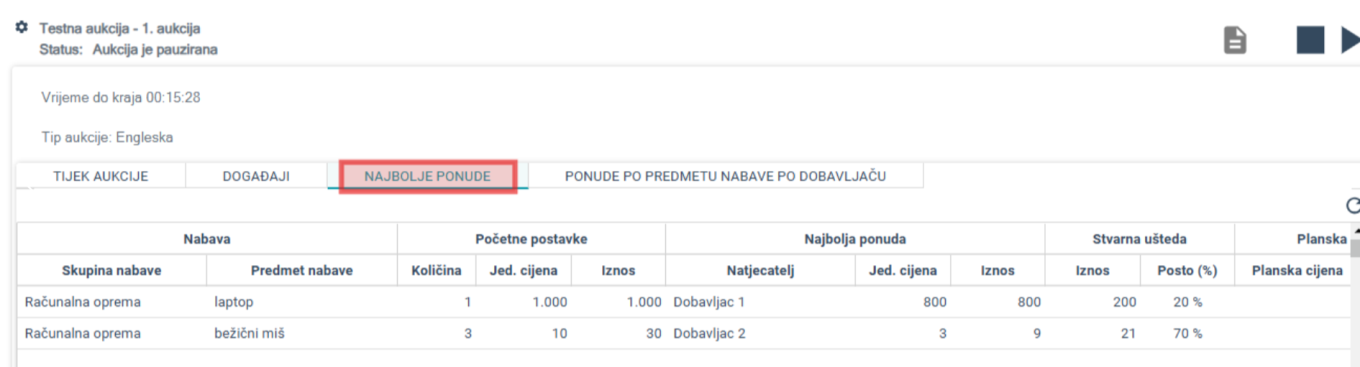 U gornjem dijelu ekrana, u tablici Najbolje ponude, za svaki predmet nabave vidljive su Početne postavke (količina, cijena, iznos), Najbolja ponuda i Ušteda (kao iznos i postotak).