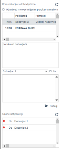 Želimo li poslati poruku samo jednom dobavljaču, odabrat ćemo dobavljača iz padajuće liste. Ako želimo poslati poruku svim dobavljačima koji sudjeluju na aukciji potrebno je odabrati opciju Svi.