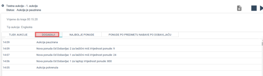 U trenutku kada neki od dobavljača pošalje ponudu (licitira), u tablici u donjem dijelu ekrana na tabovima Tijek aukcije, Događaji i Ponude po predmetu nabave po dobavljaču automatski se prikažu dobavljačev alias i vrijednost njegove ponude.