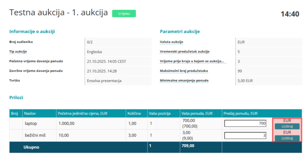Kod engleske aukcije dobavljač unosi iznos ponude prema zadanim parametrima te licitira ponudu klikom na gumb Licitiraj.