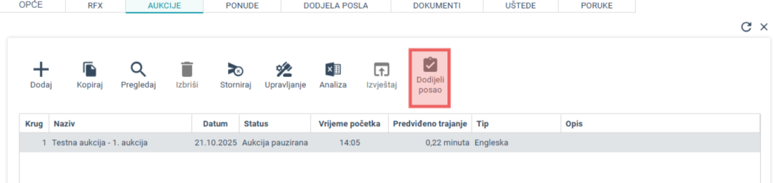 Završenu aukciju možemo prenijeti u Dodjelu posla ili pokrenuti novi krug aukcije ili RFx-a.