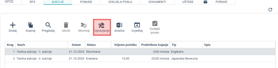 Nakon što je poziv za sudjelovanje na aukciji poslan dobavljačima potrebno je otvoriti ekran Upravljanje aukcijom.