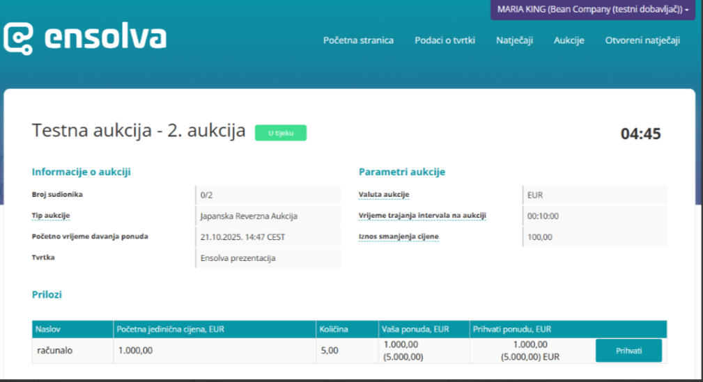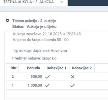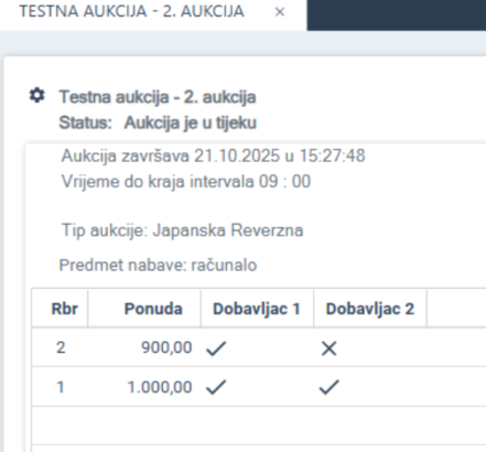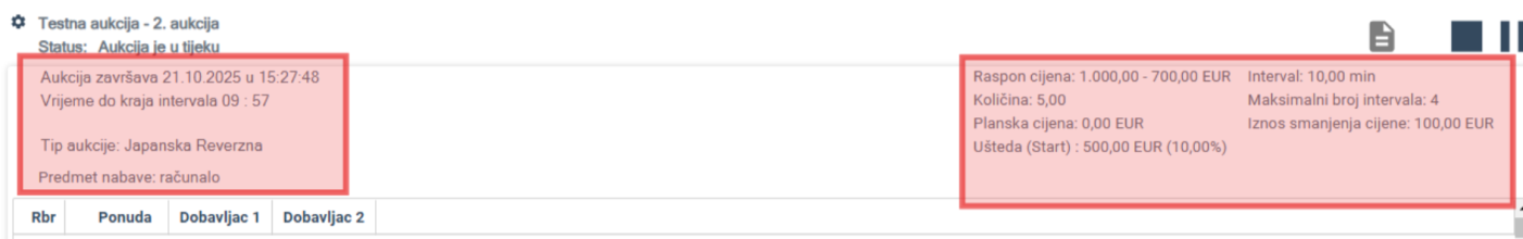 Osnovni podaci o aukciji (početna cijena, krajnja cijena, predmet nabave, količina, tip aukcije, interval, maksimalni broj intervala i iznos smanjenja cijene) vidljivi su u zaglavlju ekrana desno, dok je u