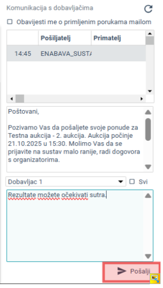 Želimo li poslati poruku samo jednom dobavljaču, odabrat ćemo dobavljača iz padajuće liste. Ako želimo poslati poruku svim dobavljačima koji sudjeluju na aukciji potrebno je odabrati opciju Svi.