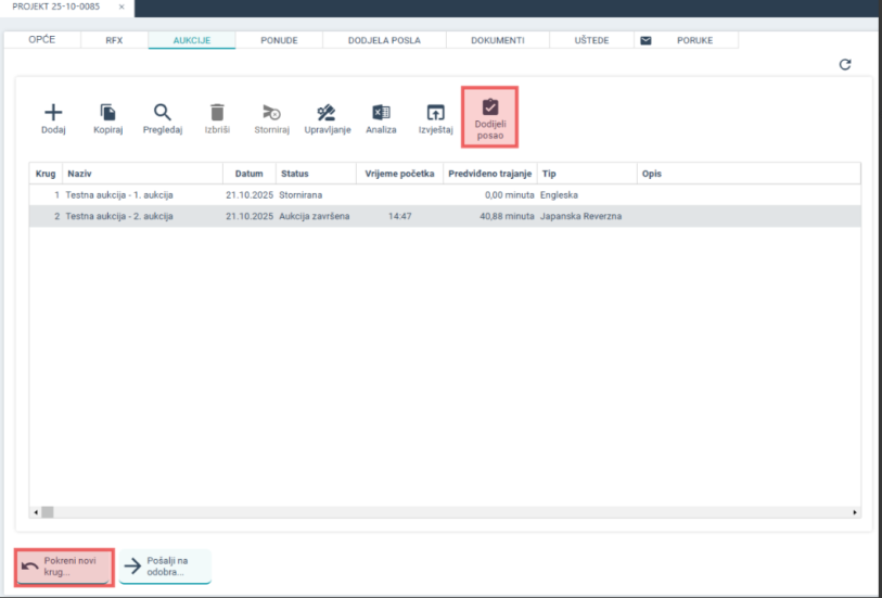Završenu aukciju možemo prenijeti u Dodjelu posla ili pokrenuti novi krug aukcije ili RFx-a.