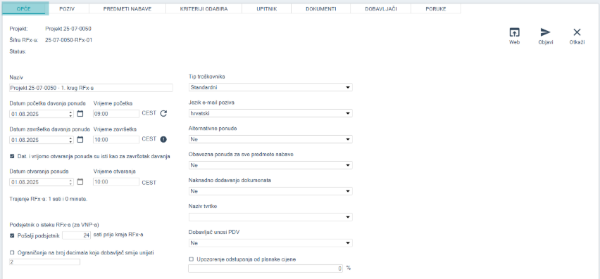 Na tabu Opće unosimo opće podatke o RFx-u (osim šifre RFx-a).