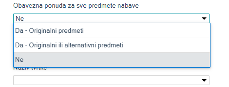 Ukoliko se na opciji "Obavezna ponuda za sve predmete nabave" odabere "NE" tada dobavljač može predati ponudu samo za određenu grupu ili predmet nabave, u suprotnom, obvezan je upisati iznose za sve stavke. Ukoliko se odabere opcija "Da - Originalni predmeti", dobavljač će morati predati ponudu za sve originalne predmete. Ako se odabere opcija "Da - Originalni ili alternativni predmeti", dobavljač će morati predati ponudu za svaku stavku, ali može biti ili originalni ili alternativni predmet, ne mora predati ponudu isključivo za original.