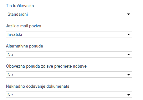 Opcionalno, moguće je odabrati tip troškovnika (standardni ili projektantski), predefinirati jezik e-mail poziva (hrvatski, engleski i srpski jezik), odabrati je li ponudu obvezno predati za sve predmete nabave i je li dozvoljena alternativna ponuda dobavljača za određenu grupu nabave ili predmet nabave te je li moguće naknadno dodavanje dokumenata nakon isteka natječaja.