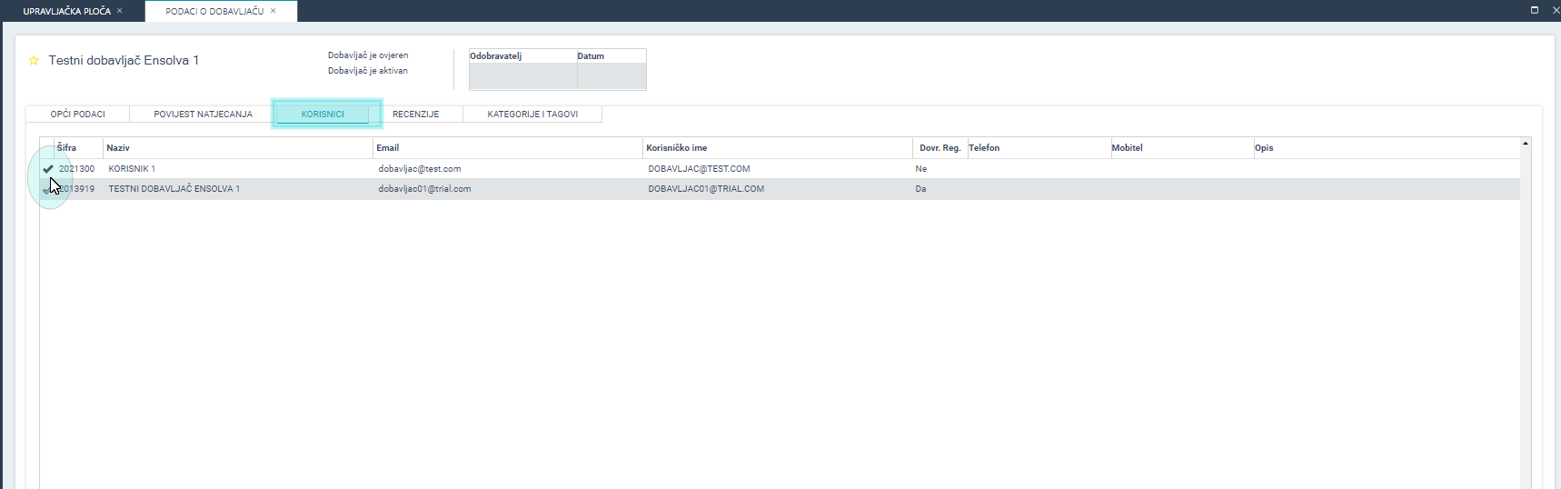 Na tabu Korisnici vidljivi su svi registrirani korisnici tvrtke dobavljača njihovi kontakt podaci. Ukoliko tvrtka želi komunicirati samo sa određenim korisnicima, moguće je isključiti ostale iz komunikacije na način da se željeni korisnik označi/odznači.
