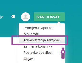 Korak 1) klikom na gumb imena i prezimena, iz padajućeg izbornika odabrati "Administracija zamjene"