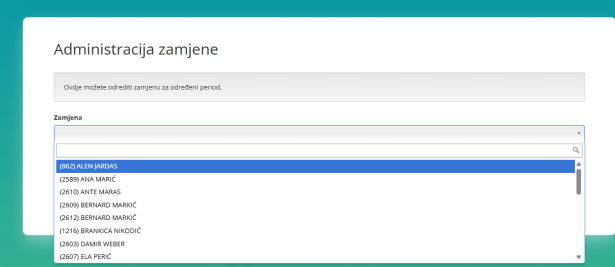 Korak 2) Klikom na gumb "Administracija korisnika" otvara se mogućnost odabira korisnika kojeg postavljamo kao zamjenu, te period na kojeg zamjenu postavljamo;