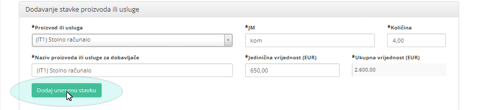 Nakon popunjavanja polja iz forme za dodavanje proizvoda/usluge na zahtjev, potrebno je kliknuti na gumb Dodaj unesenu stavku kako bi ista bila dodana na Zahtjev2Na zahtjev može biti dodano više proizvoda ili usluga..