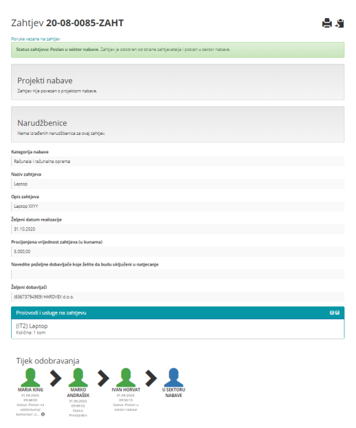 Ovisno o akciji, vidljivi su svi uneseni podaci, ime osobe koja je izvršila određenu akciju, datum i vrijeme izvršavanje akcije, status zahtjeva te ime osobe koja je zadužena za sljedeću akciju (ako korisnik ima nadređenog).