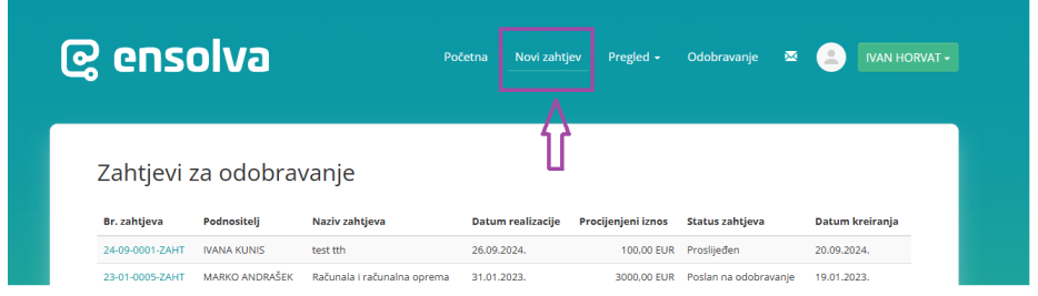 Za unos novog zahtjeva potrebno je u izborniku odabrati gumb Novi zahtjev