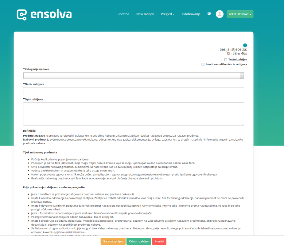 Forma za unos novog Zahtjeva potpuno se prilagođava korisniku. Ovisno o njegovim potrebama, definira se koja će se polja nalaziti na formi, odnosno koje će podatke biti potrebno unijeti da bi zahtjev mogao biti proslijeđen u sektor nabave. U sljedećem primjeru prikazan je jedna moguća verzija forme za unos.
