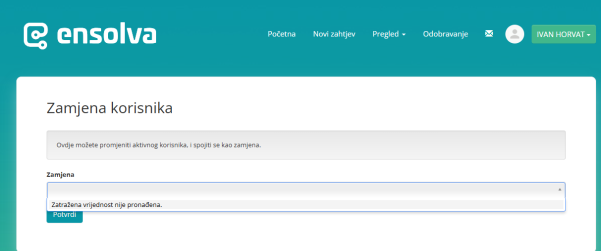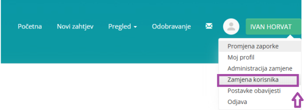 Gumb "Zamjena korisnika" u padajućem izborniku na imenu korisnika služi kako bismo dok smo prijavljeni kao mi osobno, mogli odabirom zamjene vidjeti i zahtjeve osobe koju mjenjamo i samim time dalje postupati sa zahtjevom.