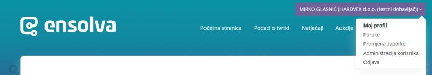 Nakon prijave na Portal dobavljača, u gornjem desnom kutu vidljivo je ime i prezime prijavljenog korisnika te naziv subjekta.