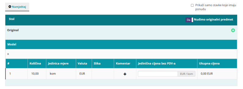 U slučaju da je ponuda dobavljača originalni predmet, odabrat će Da u opciji Nudimo originalni predmet.