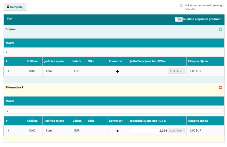 Odabirom Ne pod opcijom Nudimo originalni predmet, automatski se otvara polje za unos alternativne ponudu predmeta nabave. Omogućen je unos naziva modela, slike i cijene.
